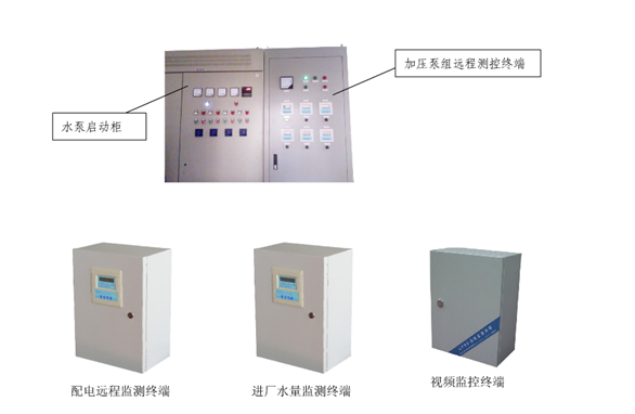 a.如果水厂的信号采集点比较集中,布线方便,可将配电远程测控终端、进水量远程监测终端、视频监控终端设备统一设置在加压泵组远程测控终端内。